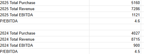 Management has maintained their price discipline, acquiring at an average of roughly 4.5x P/EBITDA (probably <4x EV/EBITDA) for both 2024 and 2025.